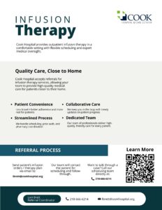 Whether you need routine iron infusions, fluid replacement, or specialized treatments for conditions like Crohn’s disease or rheumatoid arthritis, our experienced care team at Cook Hospital is here for you.